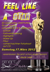 Unsere erste Veranstaltung der Reihe "Feel like a star" am 17. März 2012 war ein voller Erfolg! Die Kundinnen waren mit der Veränderung sehr zufrieden und gingen als "neue Menschen" wieder aus unserem Laden. Das anschließende Fotoshooting hielt die Ergebnisse des Umstyling fest und die Ladies bekamen diese sogar auf CD zur freien Verwendung mit.